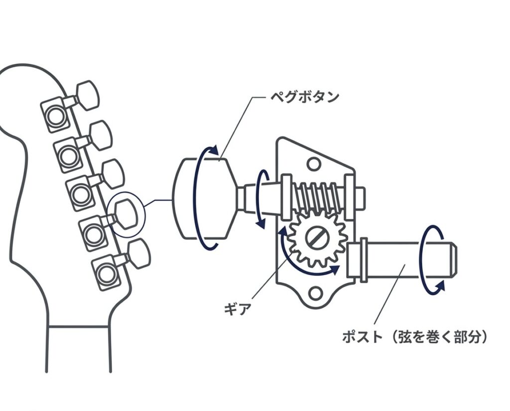 チューニング操作はペグのギア機構によって弦を巻き取り、張力を調整することで行われる。