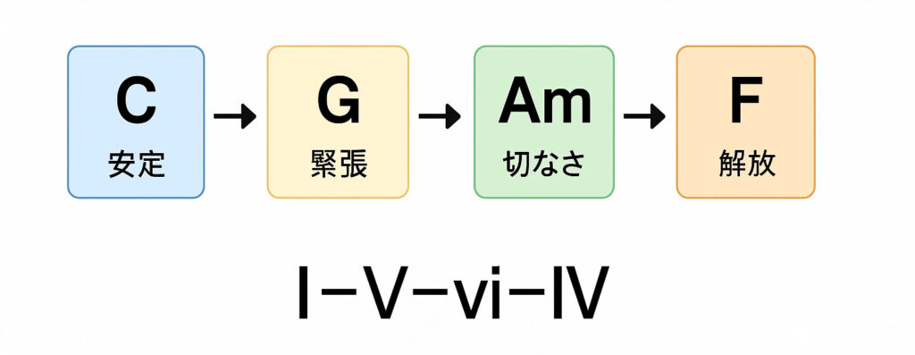 I–V–vi–IV | C–G–Am–F | 王道ポップ進行。明るく爽やかで万人受け |