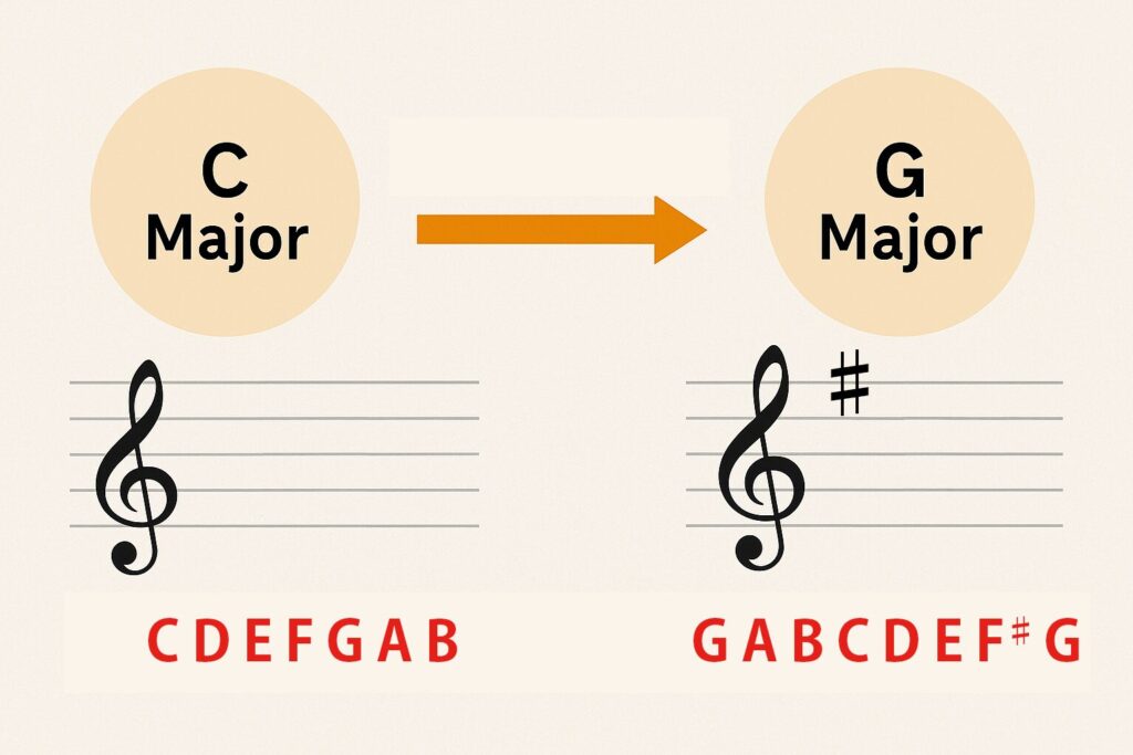 たとえば Cメジャー(ド中心)から Gメジャー(ソ中心)に変わると、響きの重心が動き、曲全体が新鮮に感じられます。