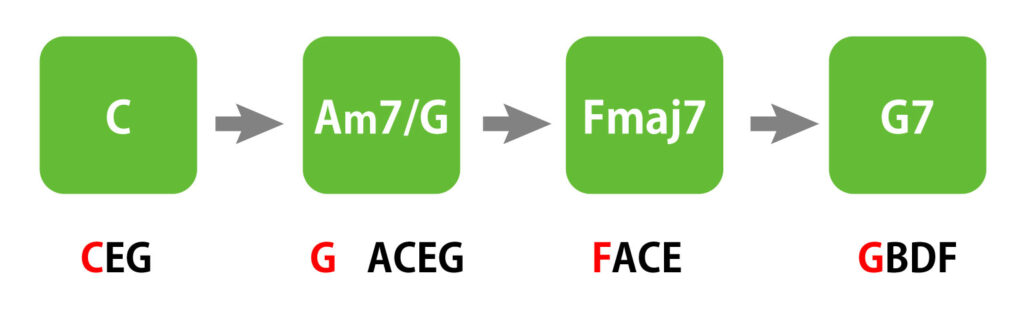 Am7/G | A – C – E – G | G(スラッシュの右側がベース) |