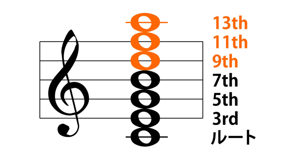 9th=2度上の音、11th=4度上、13th=6度上に相当します。